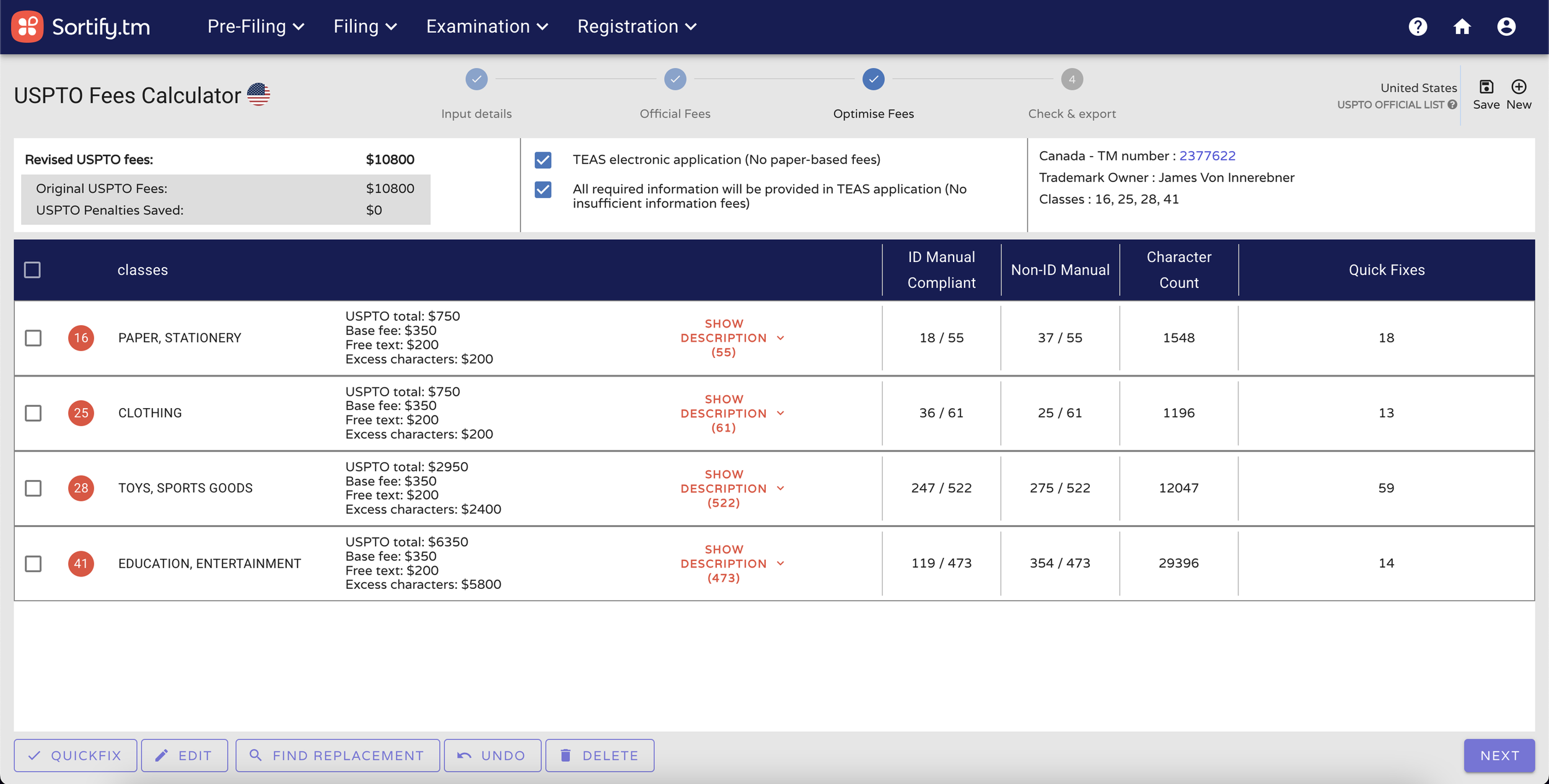 ✓ Accurately calculate official USPTO trademark fees